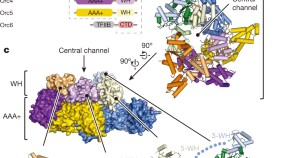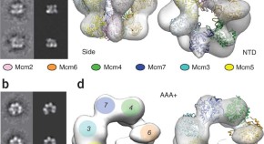 In eukaryotes, DNA replication depends on loading the ring-shaped helicase, Mcm2–7 onto double-stranded DNA and subsequent activation by GINS–Cdc45. Using single-particle EM reconstructions, the Mcm2–7 forms ring hexamers that are open between Mcm2 and Mcm5. When present, GINS and Cdc45 both seal off this gap. In the presence of a non-hydrolyzable ATP analog, two pores are formed. In this way, the complex could promote duplex opening and then segregate the two strands by partitioning them into the two pores.