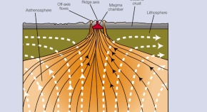 Evidence for tectonic activity under the ocean comes from molten rocks that erupt at mid-ocean ridges. Chemical differences between volcanic rocks found at the ridge and nearby support a passive model of mantle flow whereby magma rises to the surface in response to the plates moving apart.