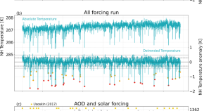 Historical aerosol forcing from large volcanic eruptions are reconstructed from sulphate deposition measured in ice cores. This study updates these records by using a more extensive collection of Antarctic ice cores, which provide new records and accurate dating of published records. The results show that prior to the year 1500 the reconstructions were either previously overestimating global aerosol forcing by 20–30% or underestimating it by 20–50%. This has implications for estimates of climate sensitivity.