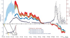 A late-autumn shoulder is consistently observed in the seasonal cycles of atmospheric methane at high latitude sites, but the sources responsible remain uncertain. This study reports methane flux measurements from a high Arctic setting during the onset of soil freezing. The integral of the emissions during this freeze-in period amount to approximately the same amount of methane emitted during the entire summer season. It is found that the observed early winter emission burst improves the agreement between the simulated seasonal cycle and atmospheric data from latitudes north of 60°N. The results suggest that permafrost associated freeze-in bursts of methane emissions from tundra regions could be an important component of the seasonal distribution of methane emissions from high latitudes.