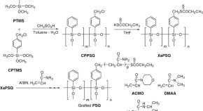 The polysilsesquioxane (PSQ) containing ethylxanthate groups was used for the graft polymerization of several acrylamide monomers by MADIX process. The controlled graft polymerization gave the PSQs containing the polymeric components as the graft chains. The introduction of the polymers provided an amphiphilic property to the polysilsesquioxaneane. In addition, the grafted PSQ containing poly(acryloyl morpholine) showed a thermoresponsive property in an aqueous solution. The reversible hydrophobic aggregation of the polysilsesquioanes was observed at ca. 80°C.