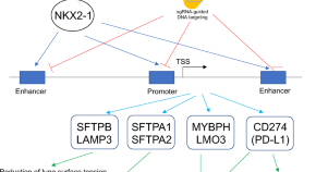The transcription factor NKX2-1 is a key regulator of lung pathophysiology, but the importance of its binding sites outside of proximal promoter regions is unclear. Here, William Stuart and Iris Fink-Baldauf et al. use CRISPRi to interrogate 19 NKX2-1 binding sites and identify specific sites important for breathing, innate immune defense, and tumorigenesis.