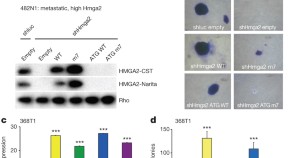 HMGA2 promotes lung cancer progression in mice and humans; in mouse and human lung cancer cells, HMGA2 competes with mRNAs like TGFBR3 for the let-7 microRNA family, and in human non-small-cell lung cancer tissue, expression levels of HMGA2 and TGFBR3 are correlated, suggesting that HMGA2 functions both as a protein-coding gene and as a non-coding RNA.