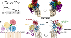 In human cells, P5B‐ATPases execute export of spermine from lysosomes to the cytosol, but the mechanisms of spermine recognition, uptake and transport remain elusive. Here the authors present cryo‐EM structures of a yeast homolog of human ATP13A2‐5, Ypk9, which depict three separate transport cycle intermediates, including spermine‐bound conformations