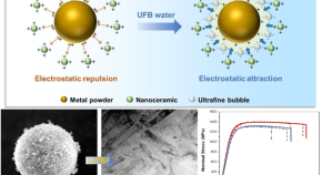 A facile and scalable approach was developed using ultrafine bubble (UFB)-assisted heteroagglomeration to fabricate high-concentration, impurity-free nanoceramic/metal composite powders for additive manufacturin. Individual ZrO2 or Al2O3 nanoparticles up to ~10 wt% were homogeneously decorated on the surface of Ti-6Al-4V powders through the bridging effect of the negatively charged UFBs. The nanoceramics were completely decomposed and dissolved into the matrix upon laser irradiation; therefore, a unique Ti nanocomposite exhibiting both high strength and ductility was obtained.