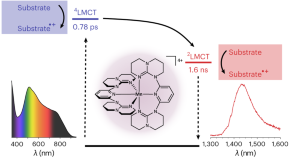 • The design of highly oxidizing Earth-abundant transition metal complexes for photochemical applications is desirable, but progress in this area remains limited. Now a manganese(IV) diguanidylpyridine complex has been shown to photooxidize naphthalene, benzene and acetonitrile to their radical cations after excitation with near-infrared light. Experimental and theoretical studies indicate the presence of two distinct ligand-to-metal charge transfer excited states.
