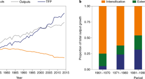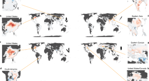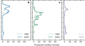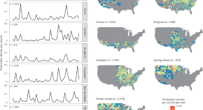 An analysis of the global production of maize, rice, soybean and wheat from 1961 to 2008 reveals that, although production synchronization within these crops has decreased, leading to increased stability, synchrony between crops has increased, resulting in higher instability of global total calorie production.