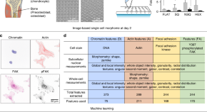 The surface nanotopography of biomaterials direct cell behavior, but screening for desired effects is inefficient. Here, the authors introduce a platform that enables prediction of nanotopography-induced gene expression changes from changes in cell morphology, including in co-culture environments.
