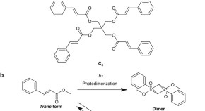 A network polymer with photoinduced mending ability is prepared from a cinnamoyl-telechelic prepolymer and a tetra-cinnamoyl linker by photodimerization. Though the trans–cis isomerization competes with the dimerization of cinnamates, the dimerization primarily proceeds at a temperature higher than the melting point of the prepolymer. When a film of the network polymer is damaged, cinnamate dimers in the polymer are dissociated to form cinnamate monomers. These monomers can be dimerized again by photoirradiation to recover the network structure.