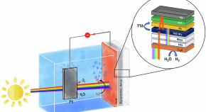 Photoelectrochemical water splitting uses solar radiation for hydrogen production. Here, triplet-triplet annihilation-based upconversion is integrated into a water-splitting device which improves the light-harnessing properties of the photoactive materials