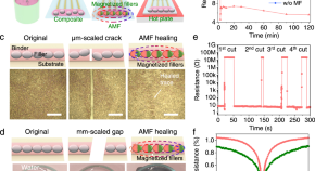 Flexible magnetic sensors with high sensitivity have a wide variety of medical and industrial uses, however, making such sensors robust and flexible at the same time can be challenging. Here, the authors demonstrate a high sensitivity flexible magnetic sensor that exhibits self-healing under an applied alternative magnetic field, with complete performance recovery.