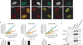• The chromatin mark H3K27me3 is transmitted during cell division by recruitment and binding of the PRC2 complex, which maintains the mark and leads to methylation of H3K27 on newly incorporated histones.