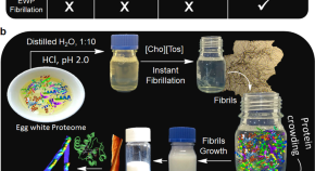 The applicability of protein fibrils as functional biomaterials is limited due to low scalability of production process, slow kinetics, and requirement of expensive purified proteins. Here, instantaneous production of protein fibrils from egg white proteome using cholinium tosylate as a fibrillation agent is shown, with the obtained fibrils displaying enhanced mechanical stiffness and cytocompatibility.