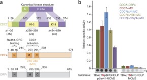 The kinase CDC7 is essential for replication initiation in eukaryote organisms. To exert its function, CDC7 requires its activator, DBF4. Now the crystal structures of a minimal CDC7–DBF4 complex, with bound nucleotide or inhibitor, along with functional analyses reveal that DBF4 wraps around CDC7, stabilizing the αC helix in the N lobe and tethering the C lobe of the kinase.