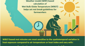 California’s farmworkers require 2–32 min of rest per hour depending on season and work shift to mitigate health risks from extreme heat, according to a study using high-resolution model outputs to translate exceedances of Wet Bulb Globe Temperature thresholds into rest break requirements.
