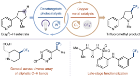 Despite the importance of trifluoromethylated compounds, direct catalytic methods for the conversion of C(sp3)–H bonds into the corresponding C(sp3)–CF3 analogues have remained elusive. This transformation has now been achieved by the merger of copper catalysis with decatungstate photocatalysis, enabling the C(sp3)–H trifluoromethylation of abundant feedstocks, natural products and pharmaceuticals.