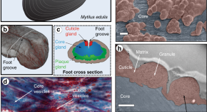 • The mussel byssus cuticle is a wear-resistant and extensible metalloprotein composite. Here, the authors probed the cuticle nanostructure and composition before, during and after fabrication revealing a crucial role of metal-binding proteins that self-organize via liquid-liquid phase separation.