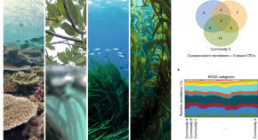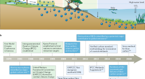 Mangroves, tidal marshes and seagrass meadows have historically been lost or degraded, threatening their ability to store carbon and provide ecosystem services. This Review details the global potential of blue carbon ecosystem protection and restoration in climate change mitigation, through carbon sequestration and co-benefit production.
