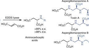 Aminocarboxylic acids are used in a broad range of domestic products and industrial applications. Here, Poelarends and co-workers report a chemoenzymatic route for the asymmetric synthesis of the antibiotic co-drug candidate aspergillomarasmine A and related aminocarboxylic acids by exploiting the broad substrate promiscuity of ethylenediamine-N,N′-disuccinic acid (EDDS) lyase.