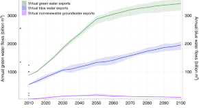 Assessments of future virtual water trading are still lacking. Here the authors estimated the global virtual water trade throughout the century and found that virtual green water exports and virtual blue water exports at least triple to more than 3200 bcm and 170 bcm, respectively, by the end of the century.