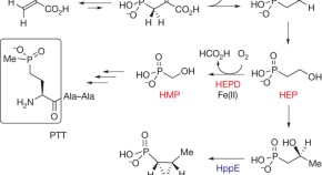 The biosynthesis of the naturally occurring compound phosphinothricin tripeptide (PTT) involves the conversion of 2-hydroxyethylphosphonate (HEP) to hydroxymethylphosphonate (HMP). This requires the cleavage of a C(sp3)–C(sp3) bond. Here, the X-ray crystal structure of the enzyme that catalyzes this reaction (hydroxyethylphosphonate dioxygenase, HEPD) is solved, and the mechanism of this remarkable transformation is explored.