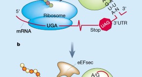 Normally, the letters UGA in the genetic code specify the end point in production of a protein. But sometimes these letters can be redefined so that the unusual amino-acid selenocysteine is inserted instead. The second component of the protein complex required for this process in mammals has now been identified.