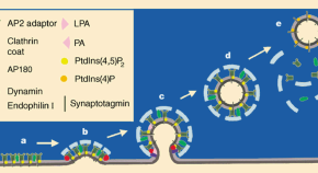 When synaptic vesicles are recycled, they are 'pinched' off from the presynaptic membrane. A protein called dynamin was thought to be the 'pinchase', but it now turns out that dynamin's function is to recruit another protein, endophilin I, to the neck of the vesicle. Endophilin I affects the composition of the lipids in the vesicle's membrane, influencing its curvature and facilitating the pinching process.