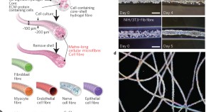 Macroscopically long, cell-encapsulating, core–shell hydrogel microfibres that can be assembled into macroscopic cellular constructs by weaving and reeling are shown to reconstitute intrinsic morphologies and functions of living tissues. When transplanted into the subrenal capsular space of diabetic mice, the microfibres normalize blood glucose concentrations for about two weeks and can later be removed.