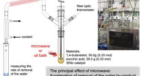 The origin of the reaction rate acceleration in the microwave-assisted synthesis of poly(butylene succinate) (PBS) was investigated by measuring the rate of removal of the water by-product from the reaction solution under equivalent reaction conditions using both microwave and conventional heating methods. Microwave heating selectively activated and removed the water from the reaction solution more rapidly and to a greater extent than oil bath heating. These results indicate that the principal effect of microwave irradiation in the synthesis of PBS was the accelerated removal of the water by-product.