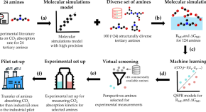 Amine mixtures are industrially used for carbon capture, whereby sluggish reaction kinetics are sped up with piperazine additives. Here, the authors report an experimentally verified computational approach that combines kinetic experiments, molecular simulations, and machine learning to identify a class of tertiary amines that absorbs CO2 faster than a typical commercial solvent when mixed with piperazine.