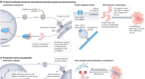 • Proteins can localize to multiple cellular compartments and some exhibit distinct functions depending on their location. This Review discusses the mechanisms of protein localization, the control of specialized protein functions through subcellular localization, and how mislocalization is involved in cancer, neurodegeneration and autoimmunity.