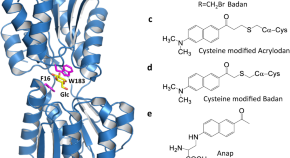 Fluorescent labeling of proteins by fluorophore Prodan is a useful tool to measure protein conformational changes via color switching, however, structure-based rules that predict where to emplace fluorophores that elicit robust fluorescent responses are challenging to establish. Here, the authors investigate mutated glucose-binding proteins labeled with Prodan derivatives, and uncover a mechanism for Prodan ligand-mediated color switching that enables structure-based biosensor design using specific steric interactions between fluorophore and protein.