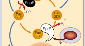 Host cells rarely wish to admit bacterial invaders, butSalmonella has developed a clever way to get around this. It first injects a protein called SopE, which stimulates the host cell's outer membrane to form ruffles and take up the bacterium. Salmonellathen injects another protein, SptP, to reverse these effects, returning the cell to its normal state so that it will survive and can provide a comfortable home for the bacterium.