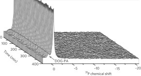 • Magic-angle spinning ssNMR used to monitor the E. coli integral membrane protein DGK reconstituted into lipid bilayers reveals the kinetics and mechanisms of this enzyme in both the membrane phase where diacylglycerol is converted to PA and in the aqueous phase where ATP is converted to ADP.