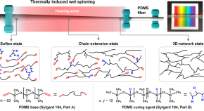 This study aimed to develop a simple and rapid method for the fabrication of transparent polydimethylsiloxane fibers based on thermally induced wet spinning, which is a modification of the conventional wet spinning. This novel method for fiber fabrication does not involve the use of a mold, and fibers with longer lengths can be produced. The use of eco-friendly oil with a high boiling point resolved the issues typically associated with solvent vapor generated during fiber fabricating using conventional wet spinning. The thickness of the fiber was controlled by adjusting the pulling speed of the cured PDMS fiber during rapid stretching.