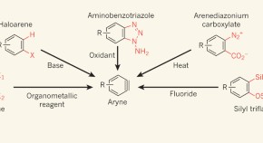 • A variant of a classical reaction has been used to generate short-lived chemical species called arynes, allowing the one-step synthesis of structurally complex benzene derivatives from simple precursors. See Article p.208