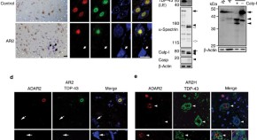 The mislocalization and downregulation of the proteins TDP-43 and ADAR2, respectively, are implicated in amyotrophic lateral sclerosis pathology. Yamashita et al. find that downregulation of ADAR2 results in calcium-permeable AMPA receptor-mediated calpain activation and subsequent aberrant cleavage of TDP-43.