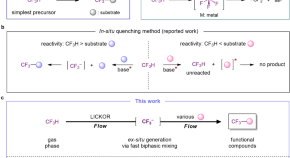 The trifluoromethyl anion rapidly decomposes into difluorocarbene (:CF2) and fluorine ion, limiting its applicability in synthesis. Here, the authors report a strategy to generate and use the short-lived CF3- intermediate from stable CF3H gas via fast biphasic mixing in precisely customized flow dissolvers.