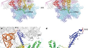 A structure of the termination complex shows that release factors that recognize stop codons cause the peptide chain and mRNA to dissociate from the ribosome at the end of translation. A conserved motif in the release factor participates in hydrolysis of the final tRNA-peptide bond.