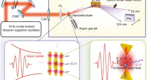 Researchers use plasmonic nanofocusing of near-infrared pulses in metallic tapered gap waveguides to generate ultrashort extreme-ultraviolet pulses. They calculate that the electromagnetic field intensity is around 350 times higher than that of a reference untapered waveguide, allowing harmonics up to the 43rd to be realized at a modest incident intensity of ∼1011 W cm−2.
