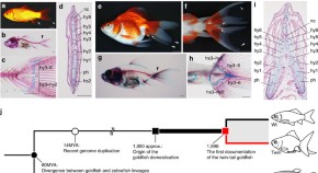 The ornamental twin-tail goldfish has a bifurcated caudal skeleton that arose during domestication, but the developmental mechanisms that generate this tail are unknown. Here, Abe et al. show that a mutation in the chordingene affects embryonic dorsal–ventral patterning causing the bifurcated tail skeleton.