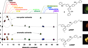 We demonstrated the synthesis of fluorescent network polymers through Knoevenagel polycondensation of an (tris(p-formylphenyl)amine) with a phenylenediacetonitrile. The structure based on the electron-donor triphenylamine and electron-acceptor cyano-substituted phenylene-vinylene showed a highly efficient solid-state fluorescence. The model molecule showed a well-defined solvatofluorochromism. Surprisingly, the network polymer linked with para-phenylene-vinylene was only responsive to the solvents with a low dielectric constant and nitrobenzene. The network polymer linked with meta-phenylene-vinylene was responsive to the aromatic solvents only. The characteristic chemoselectivity was observed by the geometric effect of the network structure.