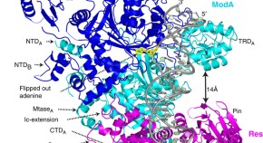 Type III restriction–modification enzymes consists of two methylation and one or two restriction subunits. Here the authors report the structure of the full EcoP15I complex bound to DNA, which suggests mechanisms for ATP hydrolysis dependent diffusion along DNA and how a dimeric methyltransferase modifies only one DNA strand.