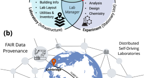 Global challenges demand global solutions. Here, the authors show a distributed self-driving lab architecture in The World Avatar, linking robots in Cambridge and Singapore for asynchronous multi-objective reaction optimisation.