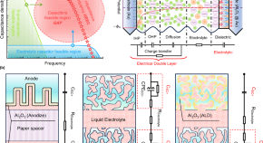The characteristic frequency of electrochemical supercapacitors is limited by ion dynamics of electrical double layer. Here, authors propose a hybrid design of electrochemical and electrolytic capacitors, operating over 44 kHz, that enables it to surpass such limitation.