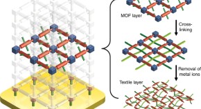 • The self-assembly of polymer threads into interwoven textiles is an important goal in polymer chemistry. Here the authors assemble interwoven polymer chains by cross-linking acetylene functionalized ligands in surface-mounted MOFs and subsequent removal of the metal ions affords 2D textile sheets.