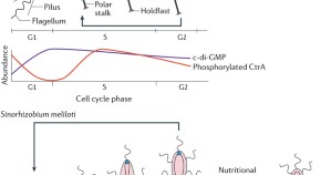 Recent studies have provided insights into the antagonistic roles of cyclic-di-GMP (c-di-GMP) and the alarmones guanosine tetraphosphate and guanosine pentaphosphate (collectively referred to as (p)ppGpp) in the regulation of the cell cycle in Alphaproteobacteria. In this Review, Viollier and colleagues discuss how those second messengers control the initiation of DNA replication and cytokinesis by modulating the synthesis and proteolysis of key regulators of the cell cycle.