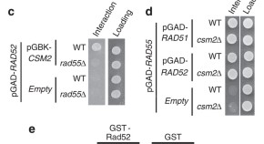 • Homologous repair of DNA double strand breaks in Saccharomyces cerevisiaeis dependent on several conserved Rad51 paralogs. Here the authors provide biochemical evidence that Rad55-Rad57 synergistically interacts with the Shu complex to promote Rad51 filament formation and homology directed repair.