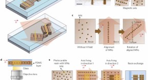 Superparamagnetic nanoparticles under an external magnetic field align in the field’s direction to minimize magnetic-dipole interactions. By modulating and fixing the alignment of magnetic nanoparticles in polymeric microcomponents through photopolymerization, magnetic nanocomposite microactuators were programmed to undergo complex motion, such as anisotropic bending and crawling.