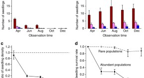 Fitness advantages conferred on species living at low density is thought to be one mechanism by which stable biodiversity is maintained. Here, Liu et al. show that recruitment of seedlings in high-density populations of a subtropical tree is suppressed by soil pathogens, with little effect at low-density.
